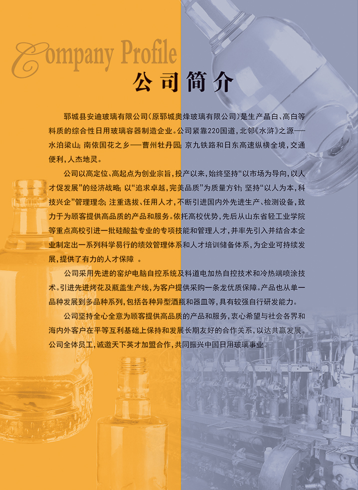 鄆城縣安迪玻璃有限公司是一家生產(chǎn)玻璃酒瓶及綜合性日用玻璃容器制造公司,緊靠220國(guó)道,北鄰《水滸》之源----水泊梁山;南依國(guó)花之鄉(xiāng)----曹州牡丹園;京九鐵路和日東高速縱橫全境,交通便利,人杰地靈。